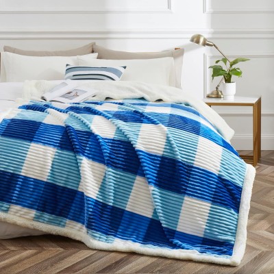 Single bed plaid thick bed blanket, super soft flannel double-sided velvet plush blanket (blue plaid, 203.2 cm * 228.6 cm)